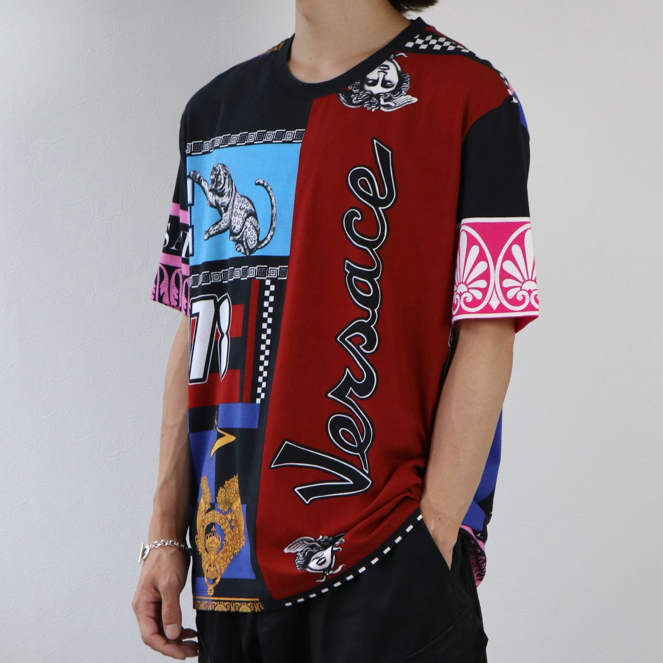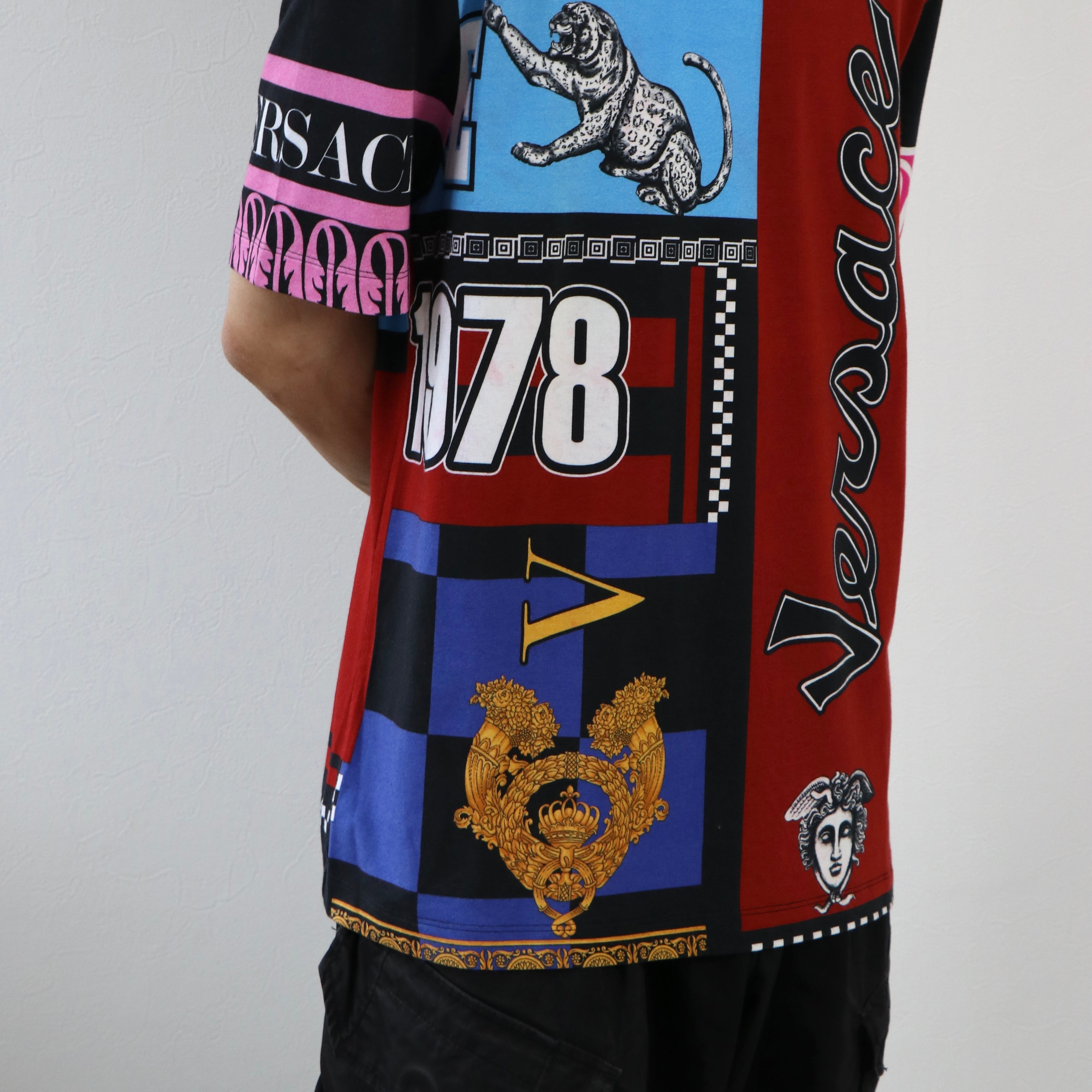ヴェルサーチのマルチカラーTシャツ。色使いに違和感がなく、シンプルなデニムなどのアイテムと合わせることで派手な印象を与えられるアイテムです。