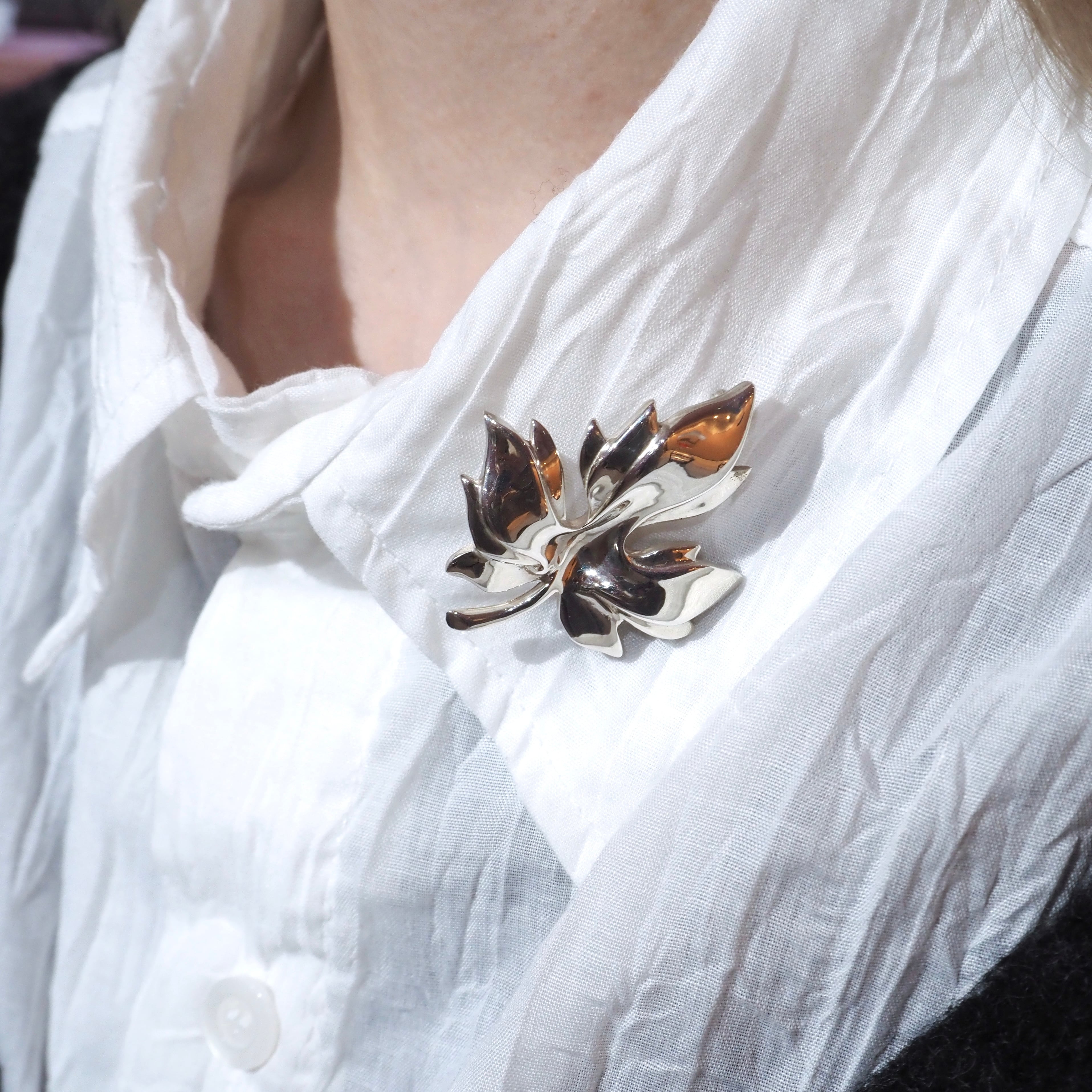 ジャケットや帽子、Tシャツをくくるなど、様々なシーンで活躍するブローチ。リーフのデザインは特に使いやすく、ブローチ初心者の方にもおすすめです。(m)