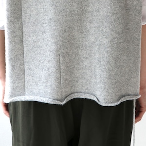 サイドが切れたデザインのニットベスト。上から被るタイプですので、開放感もありつつレイヤードを楽しめます。また、裾のほつれがワンポイントで入っているのも粋なデザインです。