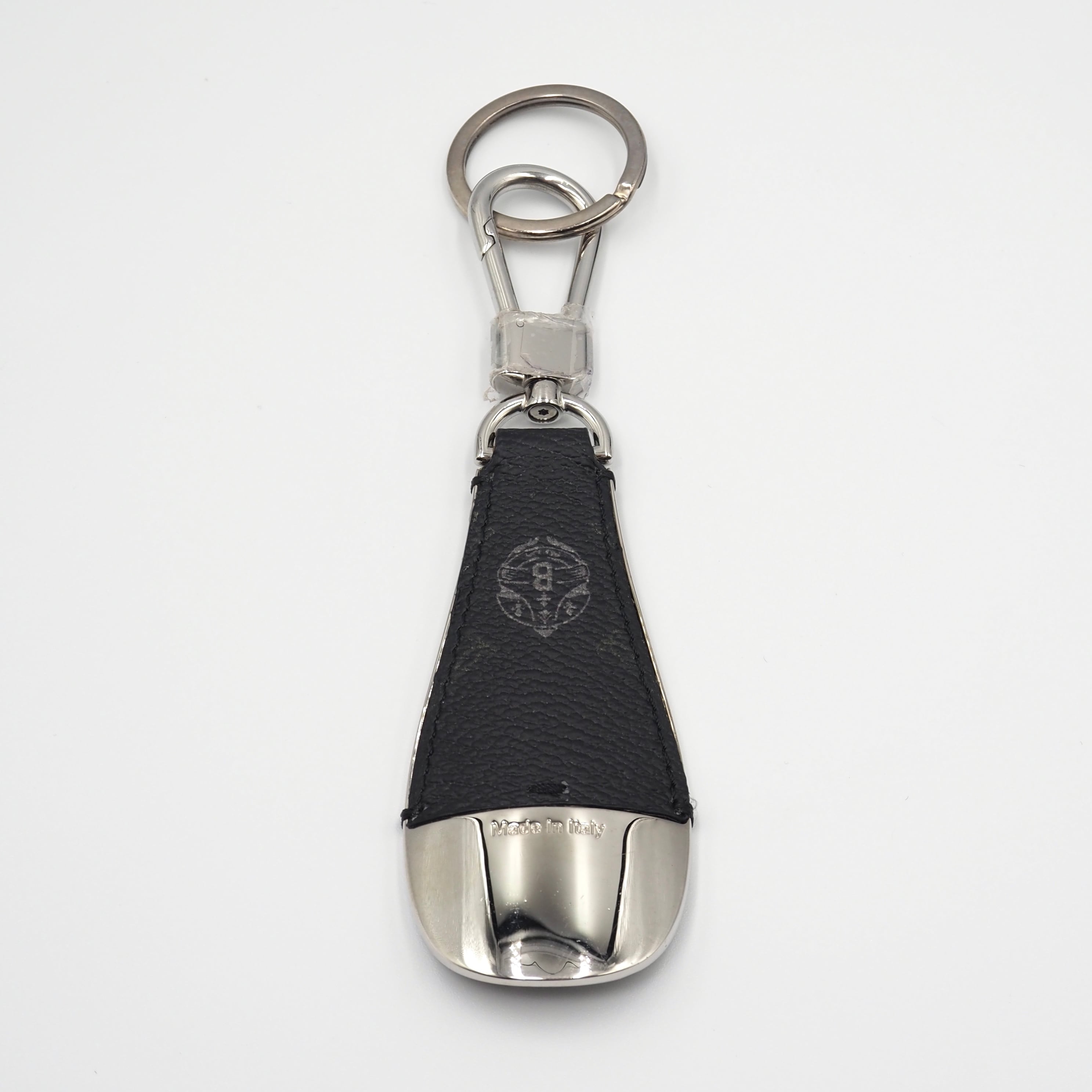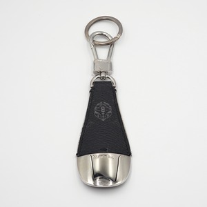 靴べらの形をした機能的なキーリング。メタルとレザーの組み合わせは、モダンで力強いラグジュアリー感を演出します。手作業で編み込まれたストップステッチが美しいアイテム。
