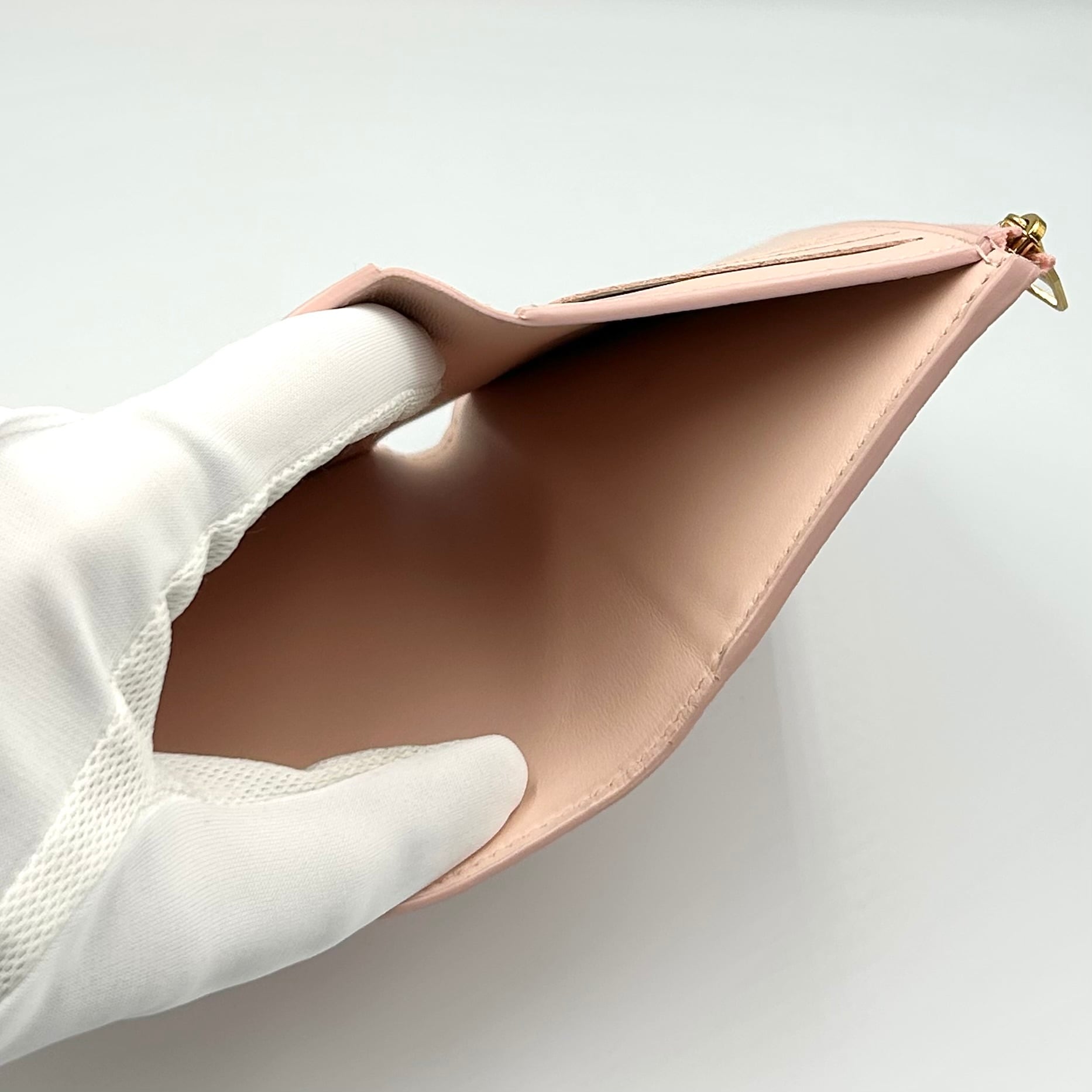 ルイ・ヴィトンの三つ折り財布。レザーで作られていますが、質感が複数ある遊び心。正面に大きくLVのロゴがありますが、ピンクのカラーが重たくなりがちなロゴを和らげてくれます。