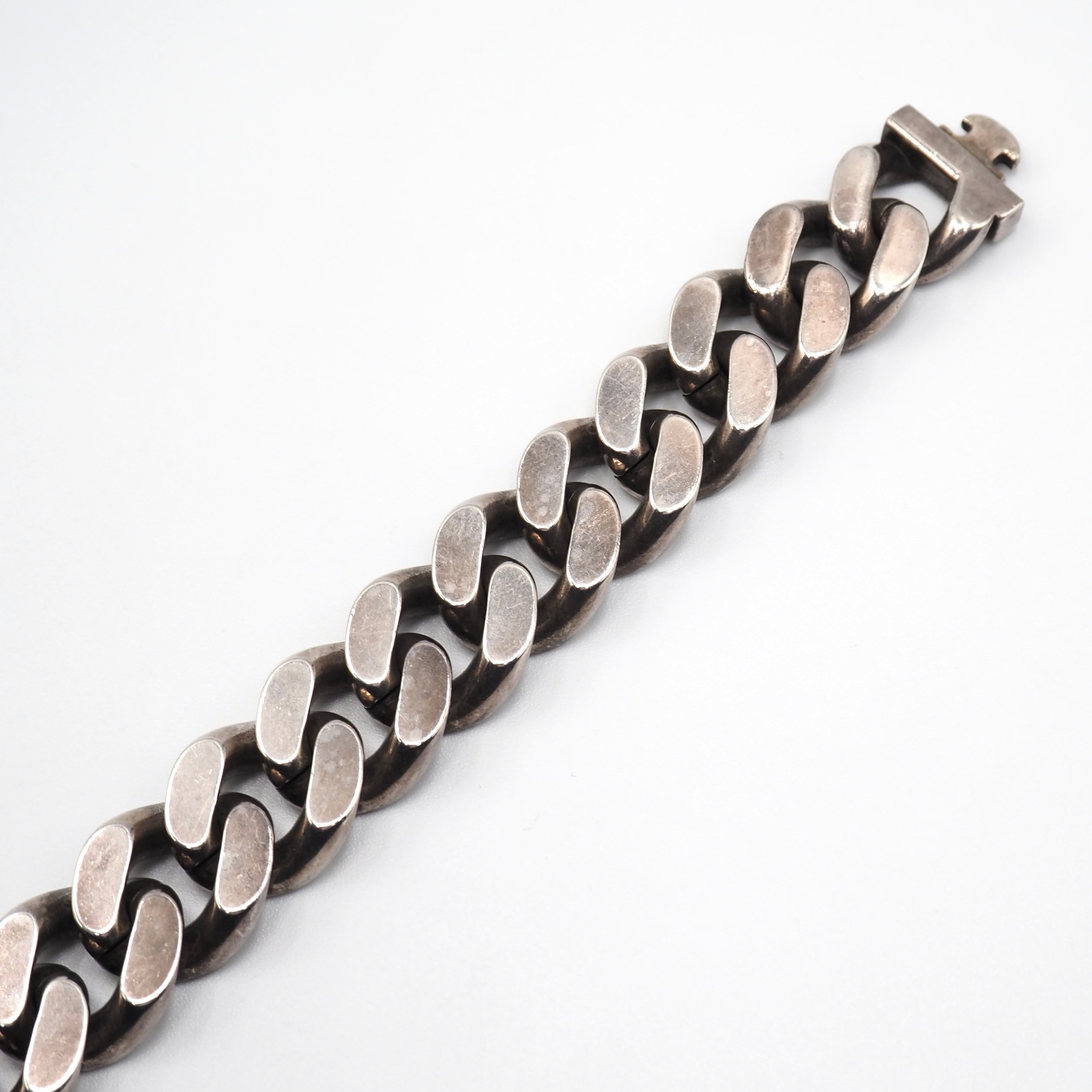 燻の効いたブラックシルバーのカラーが無骨さとヴィンテージ感を演出するアイテム。物足りなさを解消するような、存在感たっぷりなブレスレットです。