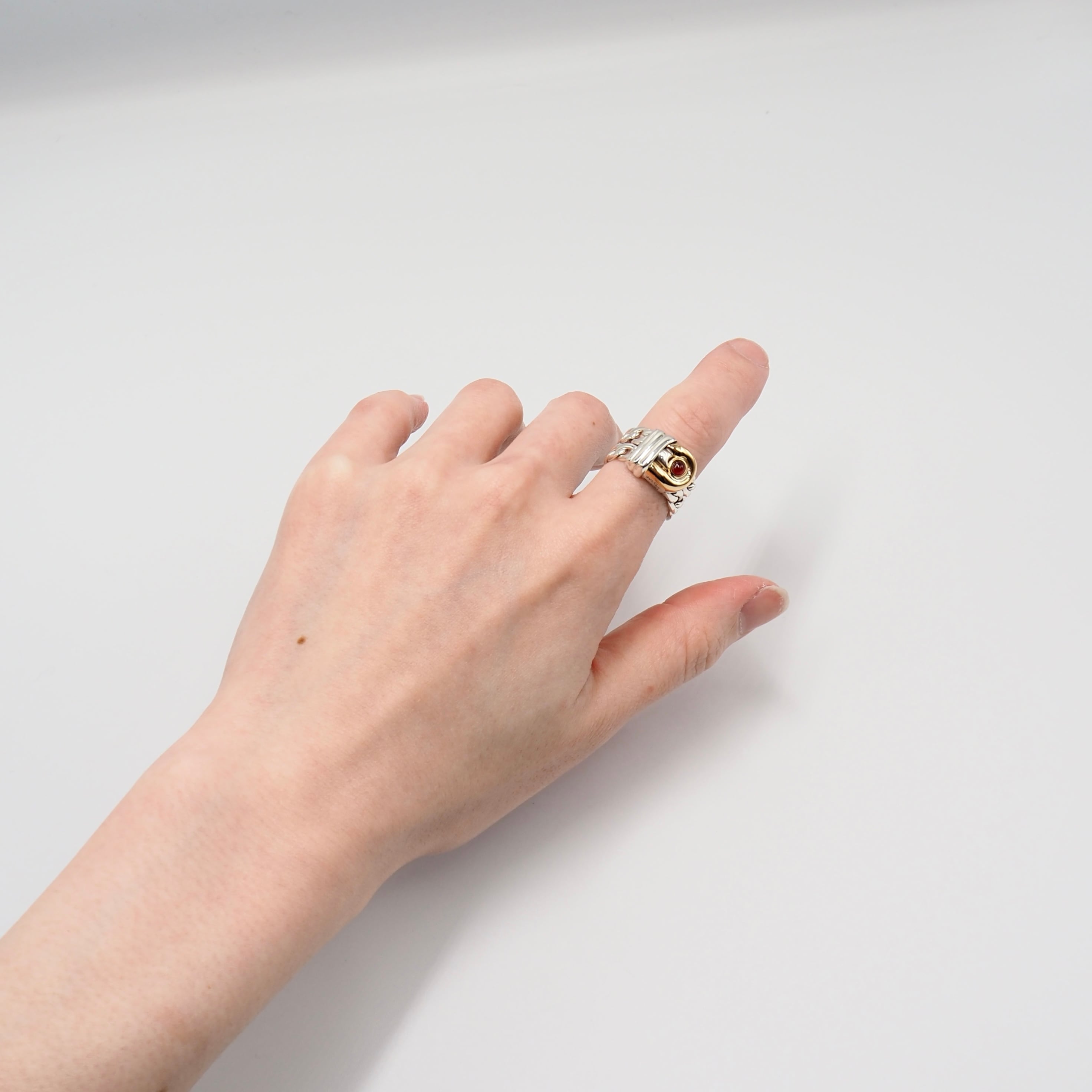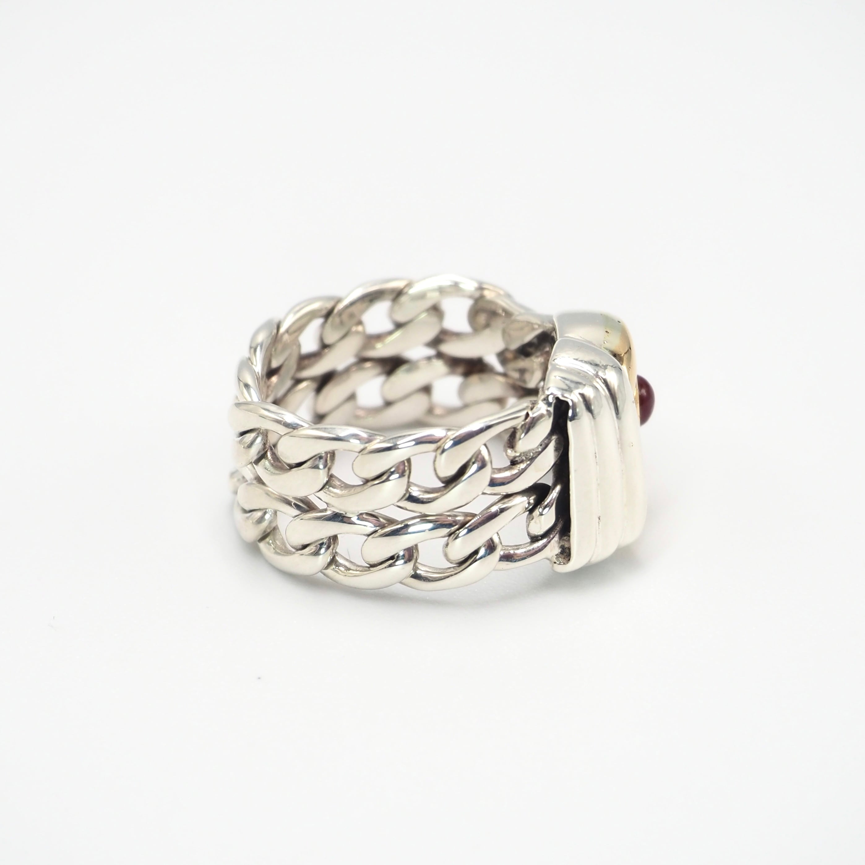 グッチのオールドライン、シルバー×k18コンビに一粒のルビーをあしらった希少なヴィンテージリング。喜平チェーン風の質感がクラシカルな表情を添え、程よいボリュームで男女問わず指先を格上げします。