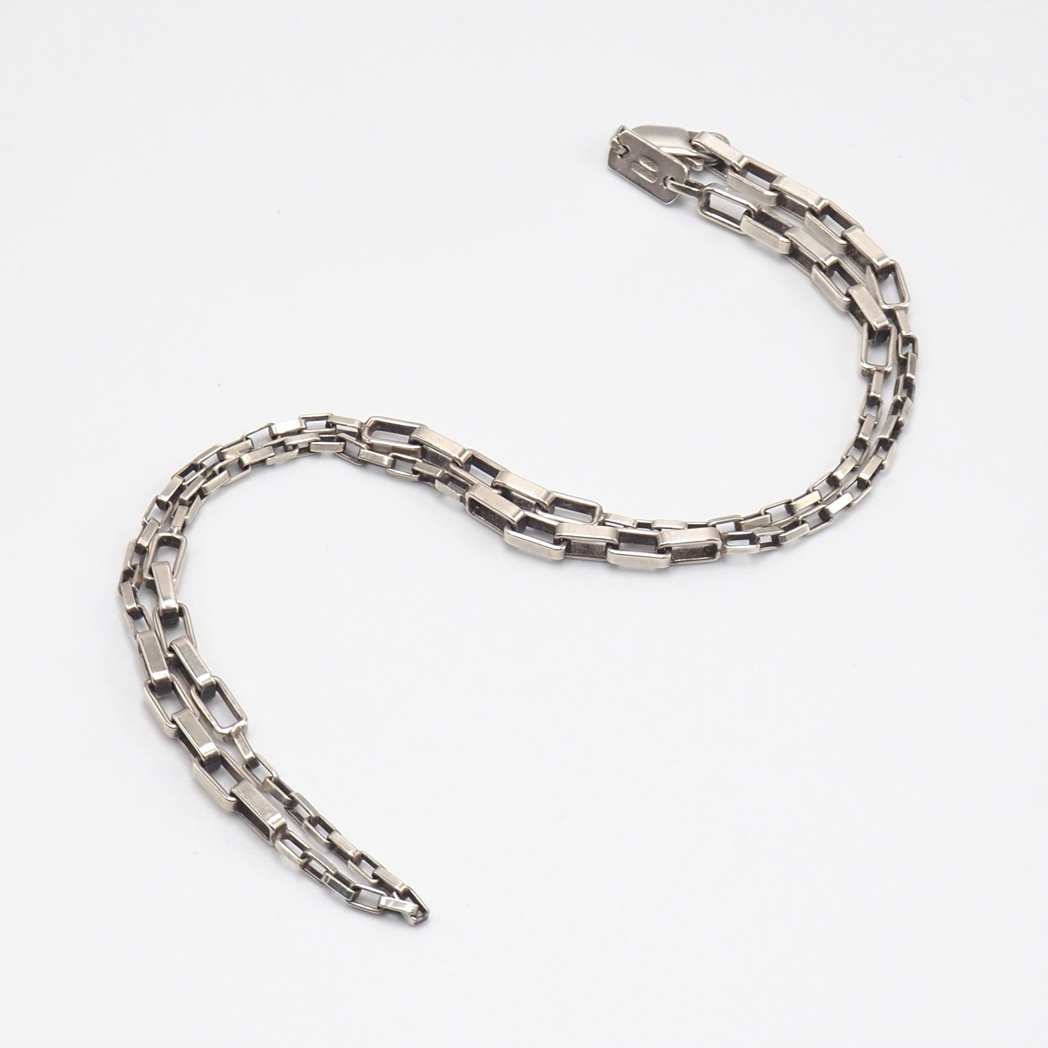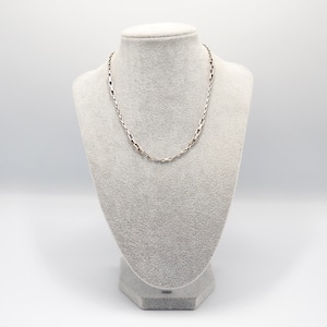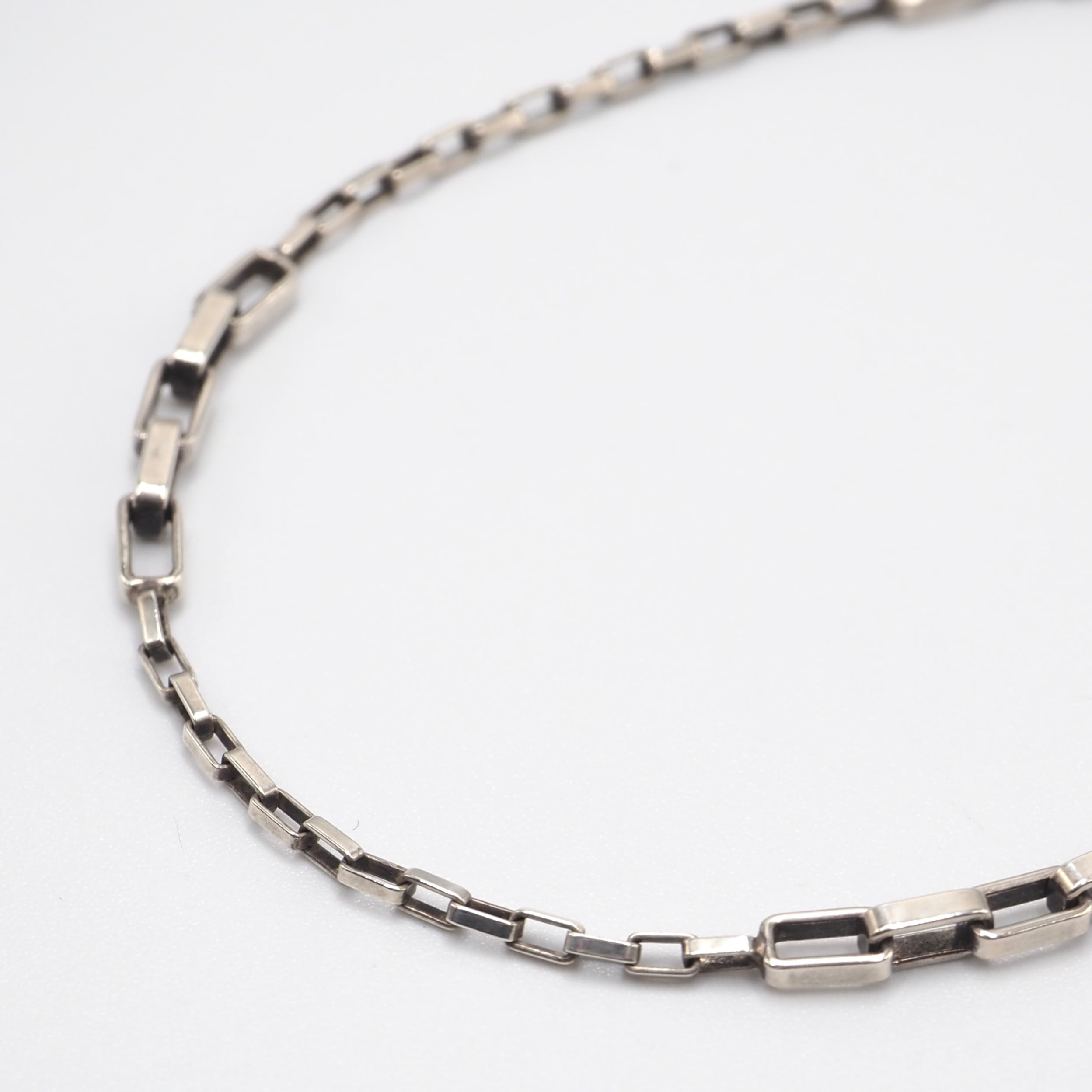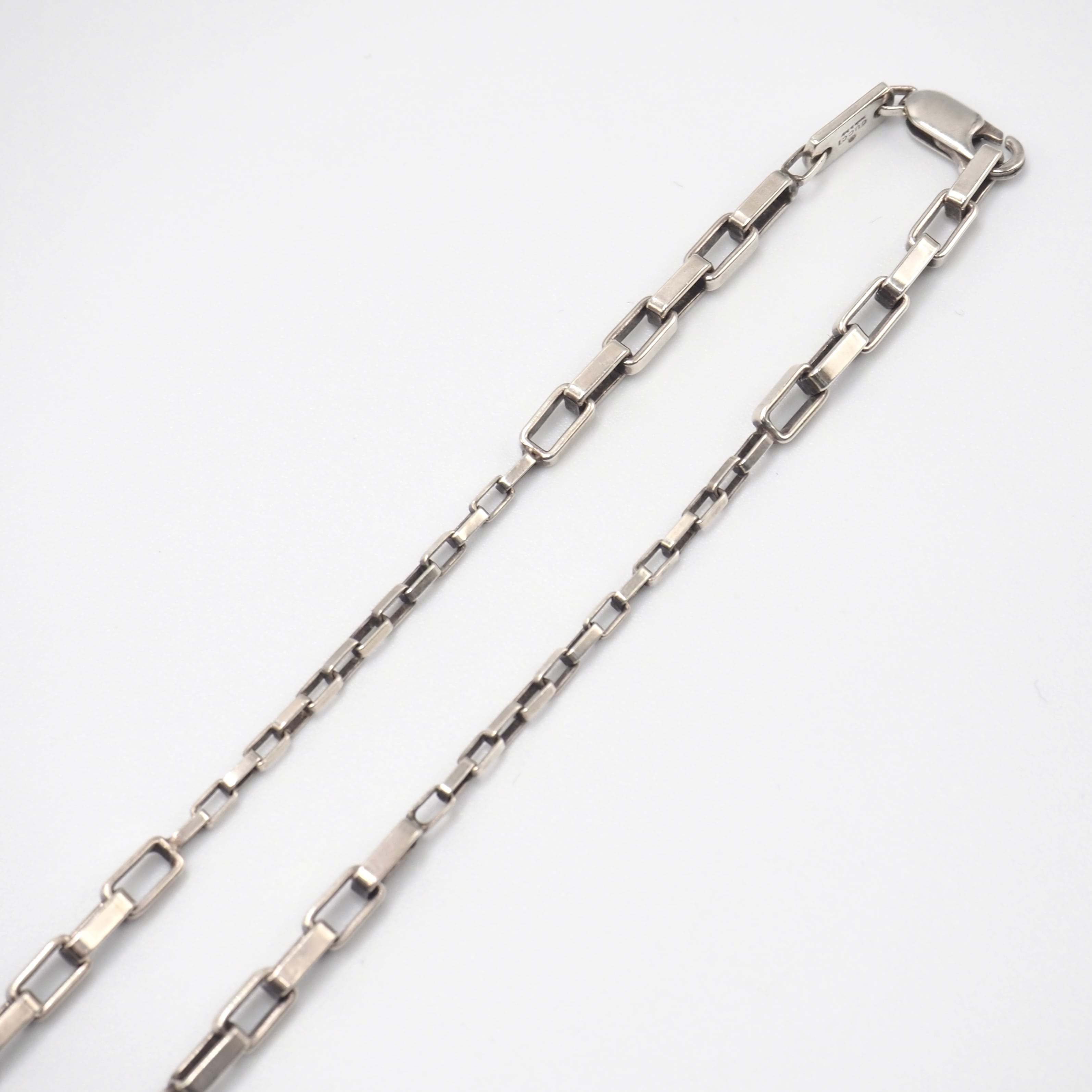 細やかに連なるスクエアリンクがしなやかに光を拾い、首元を上品に彩ります。程よい太さで一本でも存在感があり、留め具にはブランドらしい精巧な作りが感じられる仕上がり。シンプルながら質の高さが際立つアイテムです。