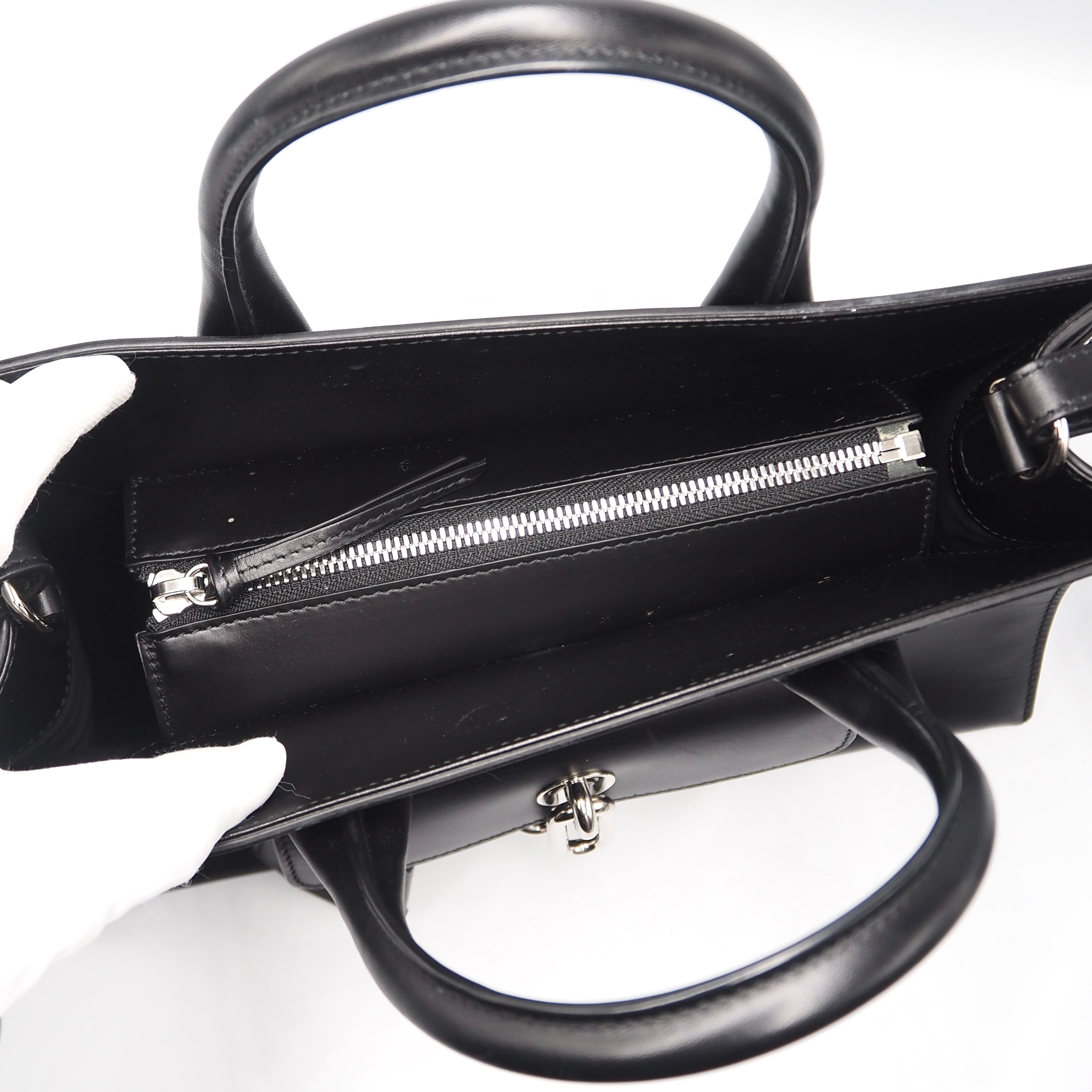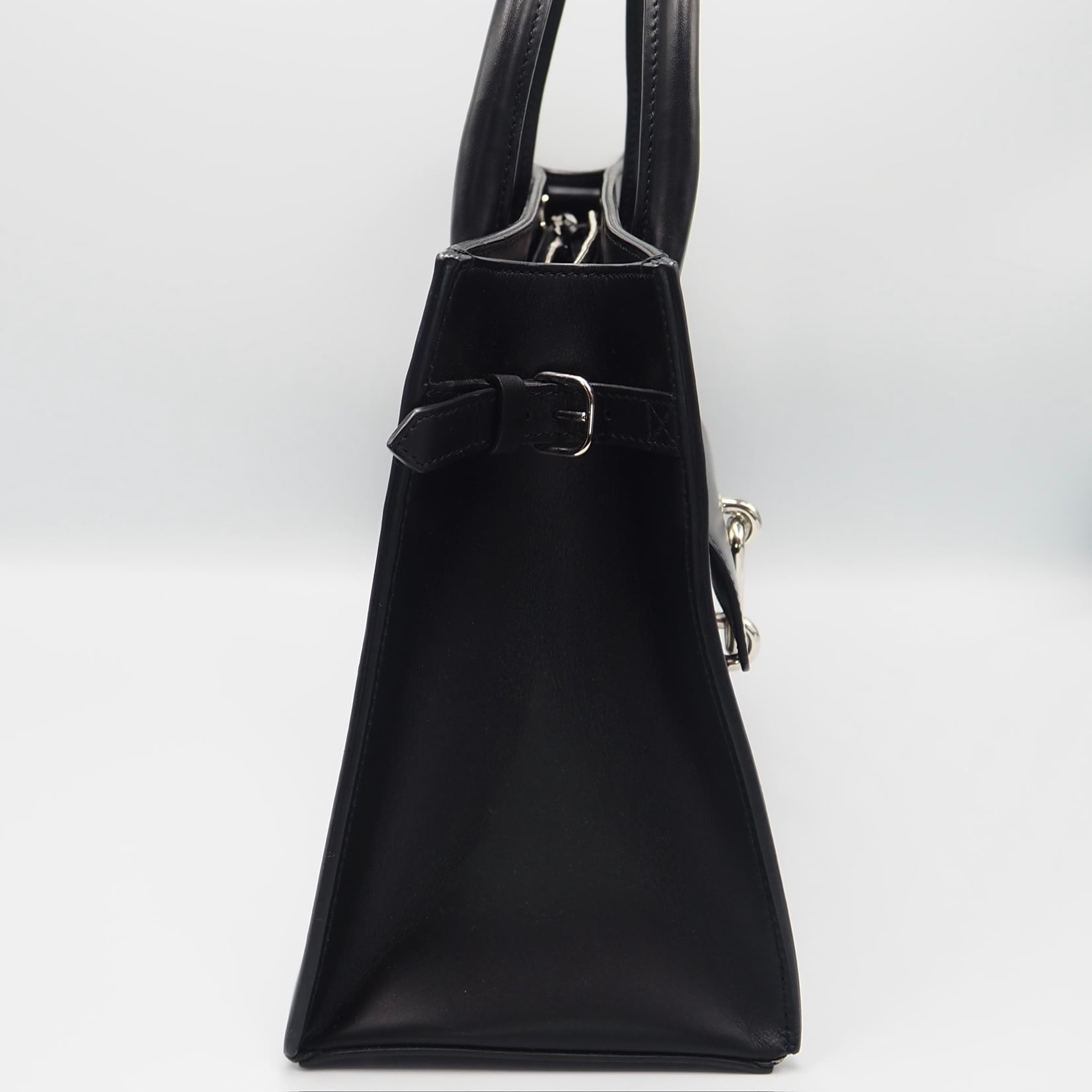 バレンシアガの2WAYバッグ。美しいフォルムと上品な雰囲気が魅力のアイテム。シンプルながらもフロントのバックルが目を惹きます。