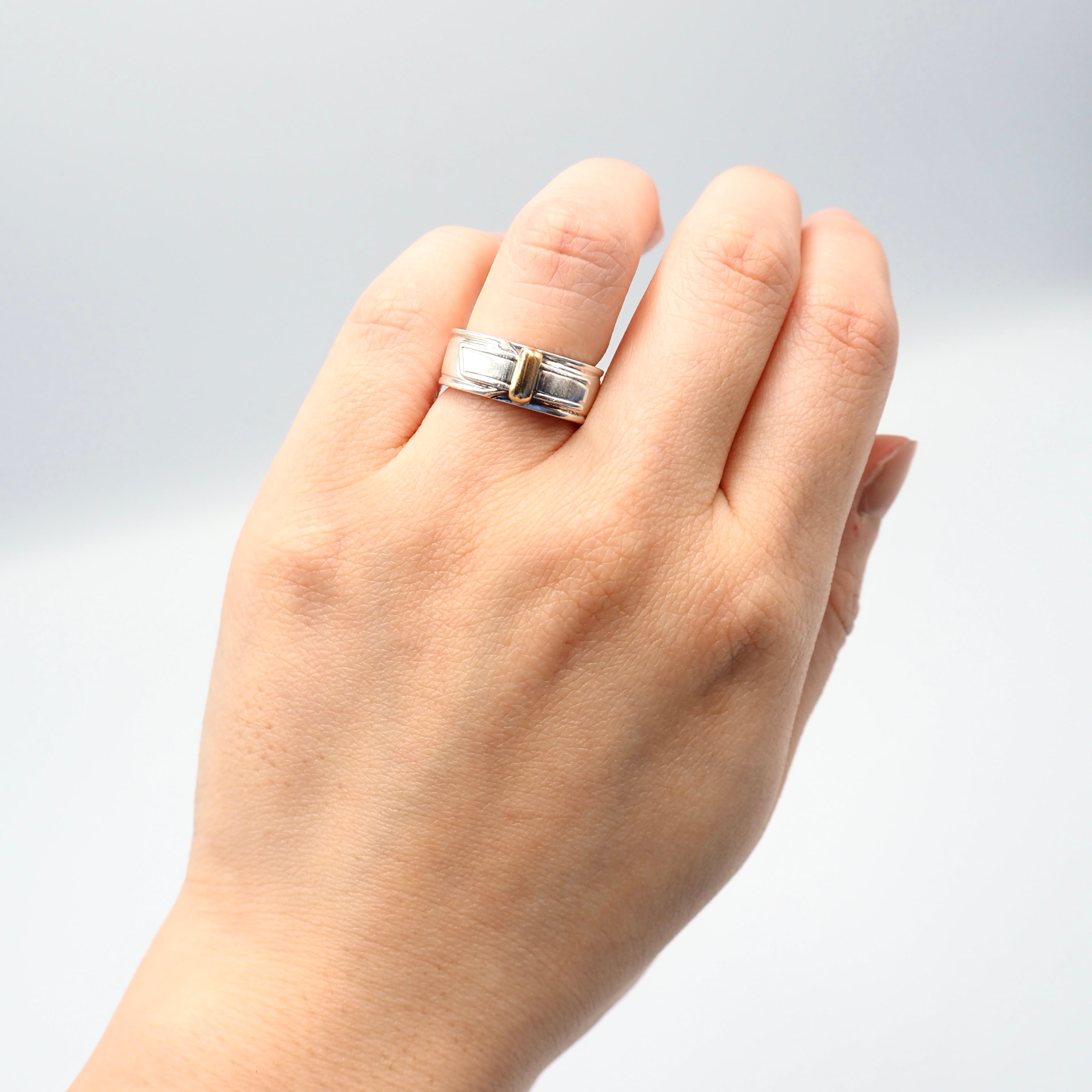 ギリシャ神話の女神の名がついた「アルテミス」。折りたたまれた立体的なシルエットは、エルメスの定番となっているデザインです。こちらのリングは18金イエローゴールドとシルバーを使用した、今では販売されていない廃盤となったデザイン。さりげなくも印象的にゴールドが輝きます