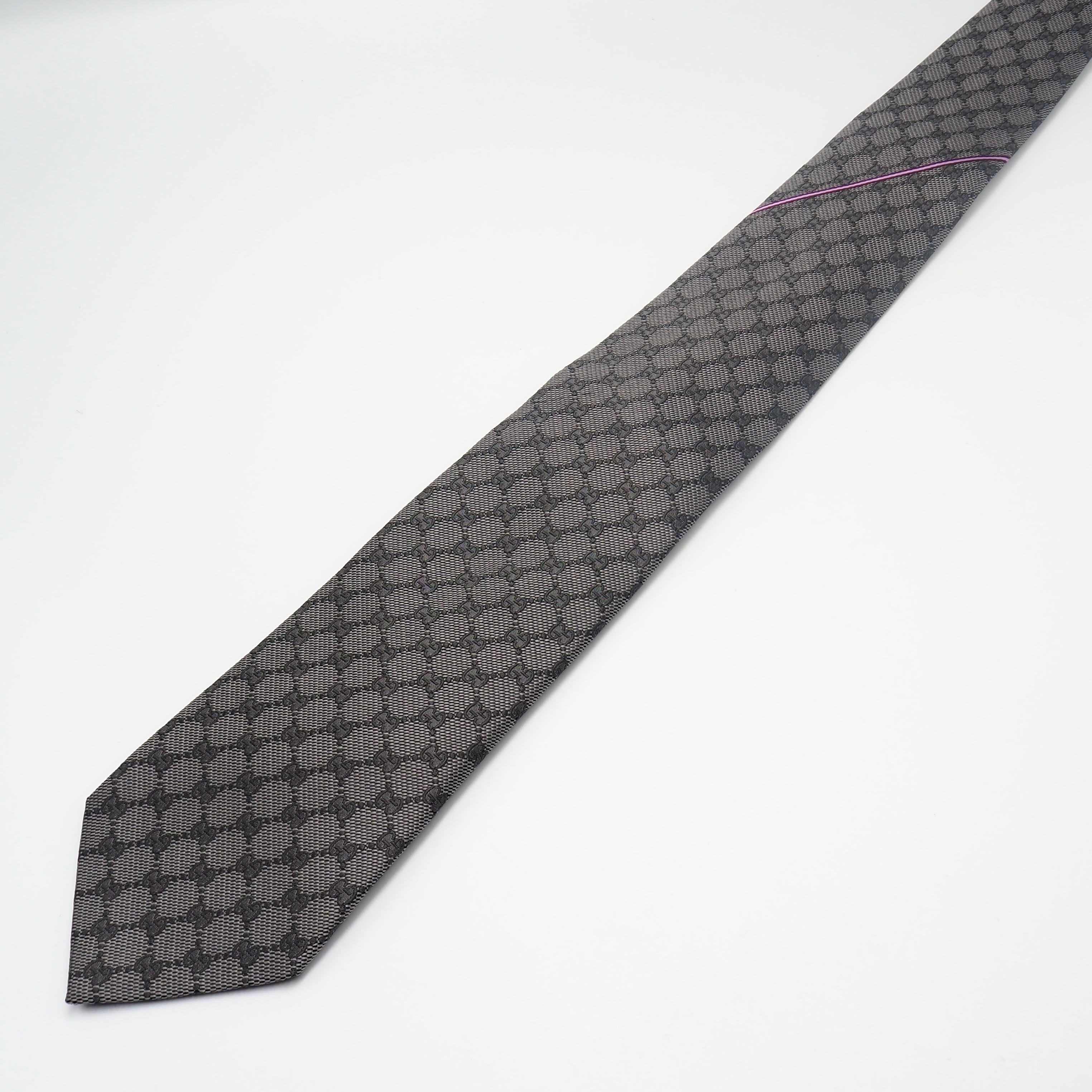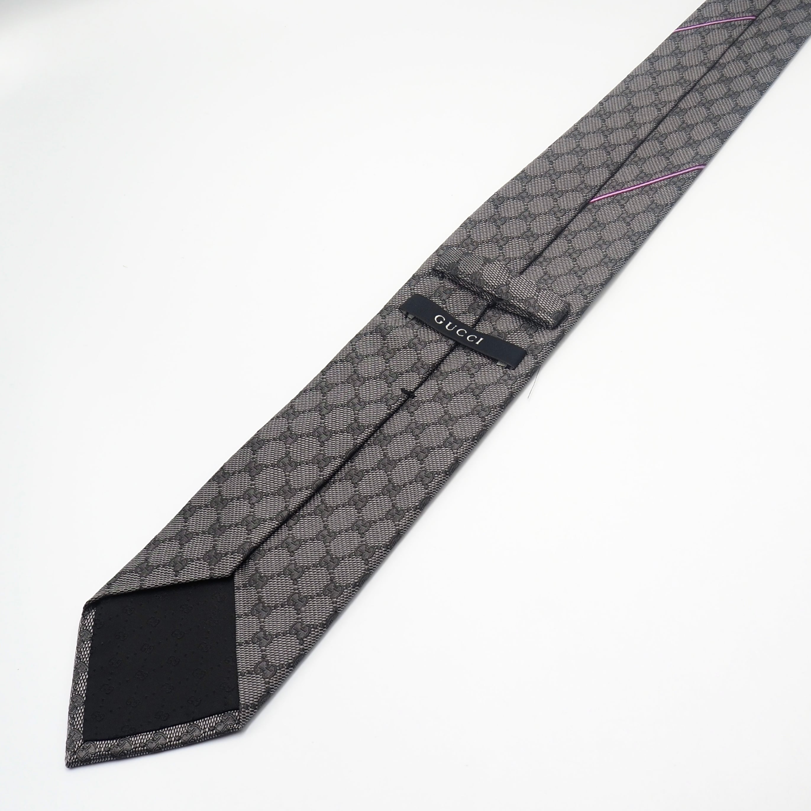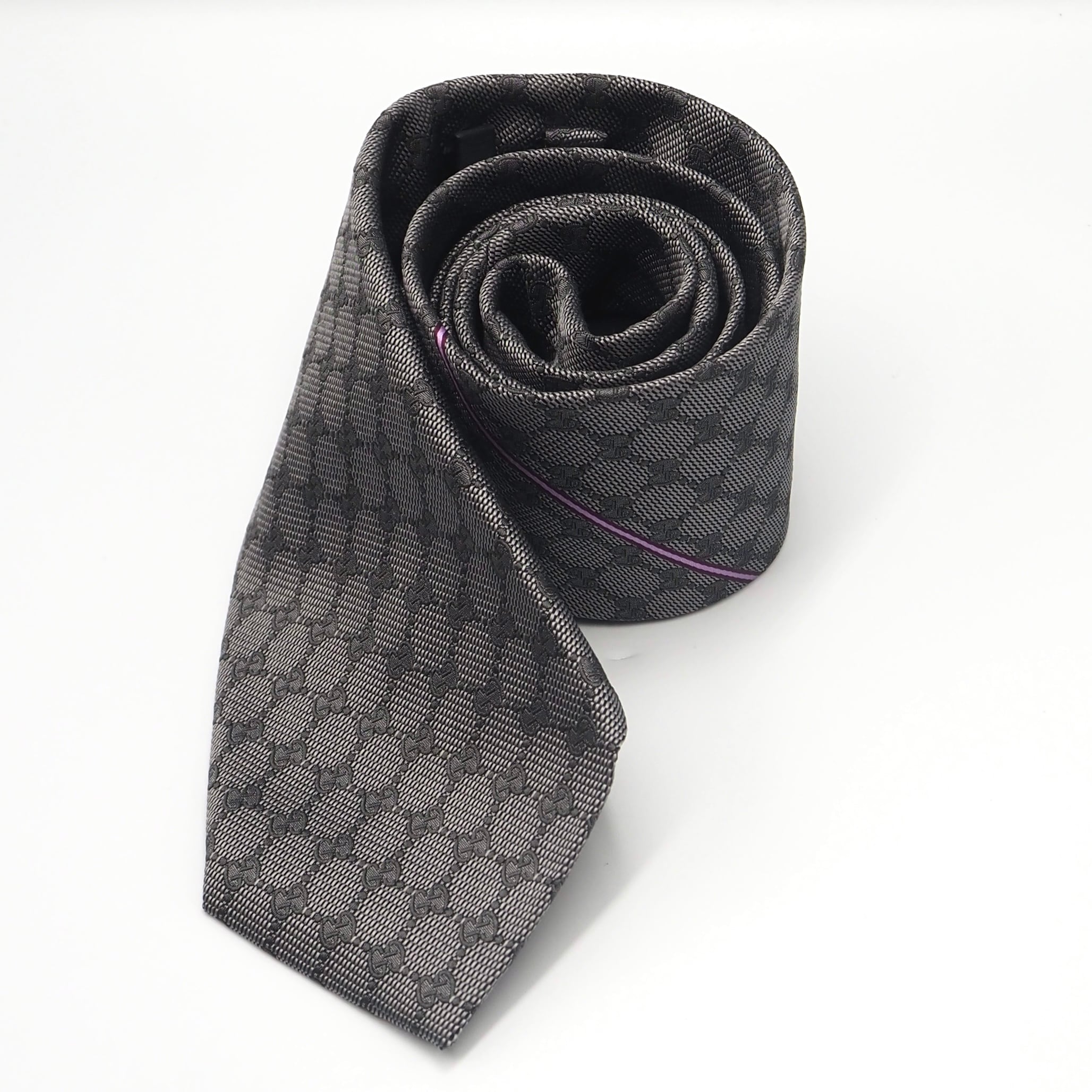 シルク独特の上質な光沢感が美しく、GUCCIを象徴するGG柄にパープルのラインがさりげなく施されたネクタイ。