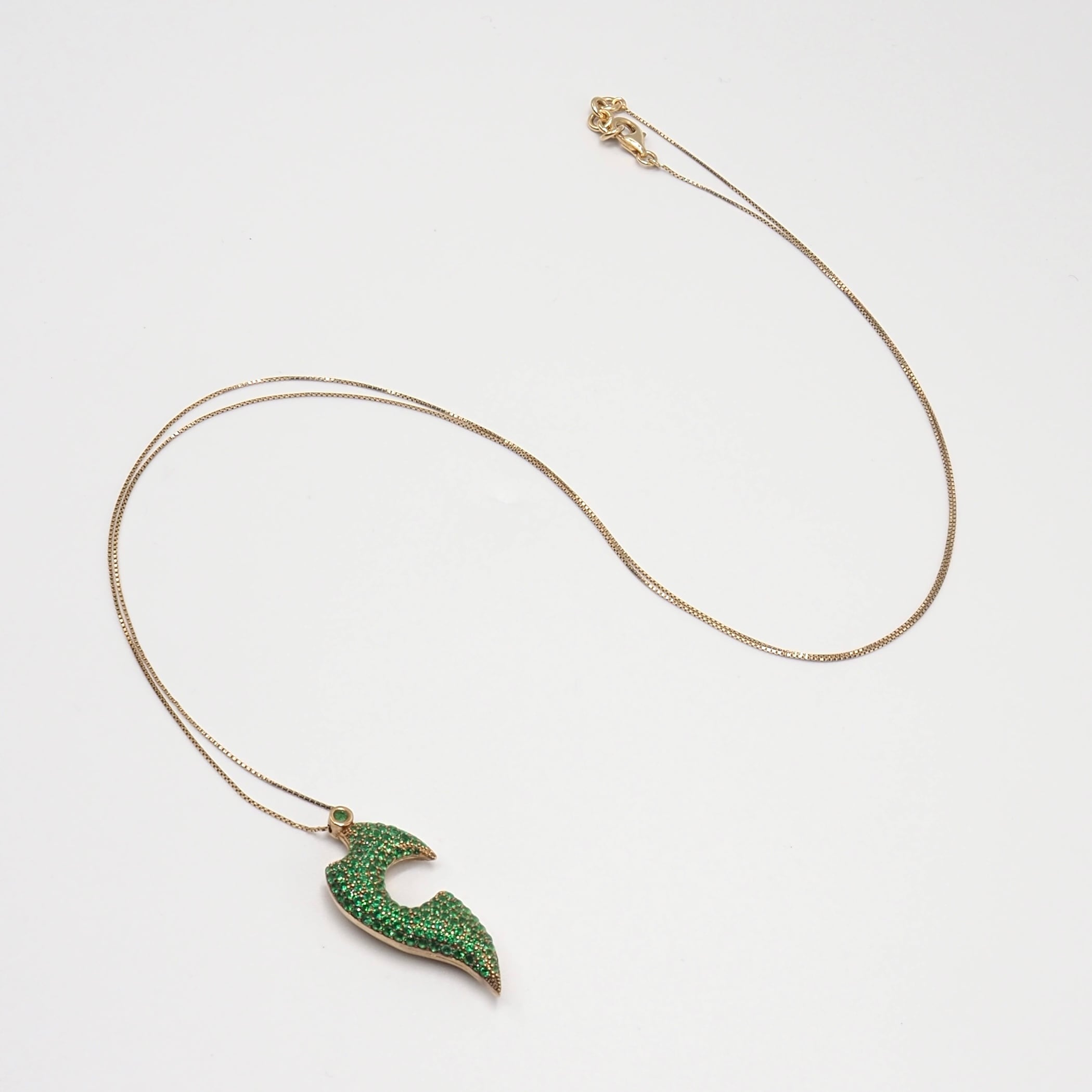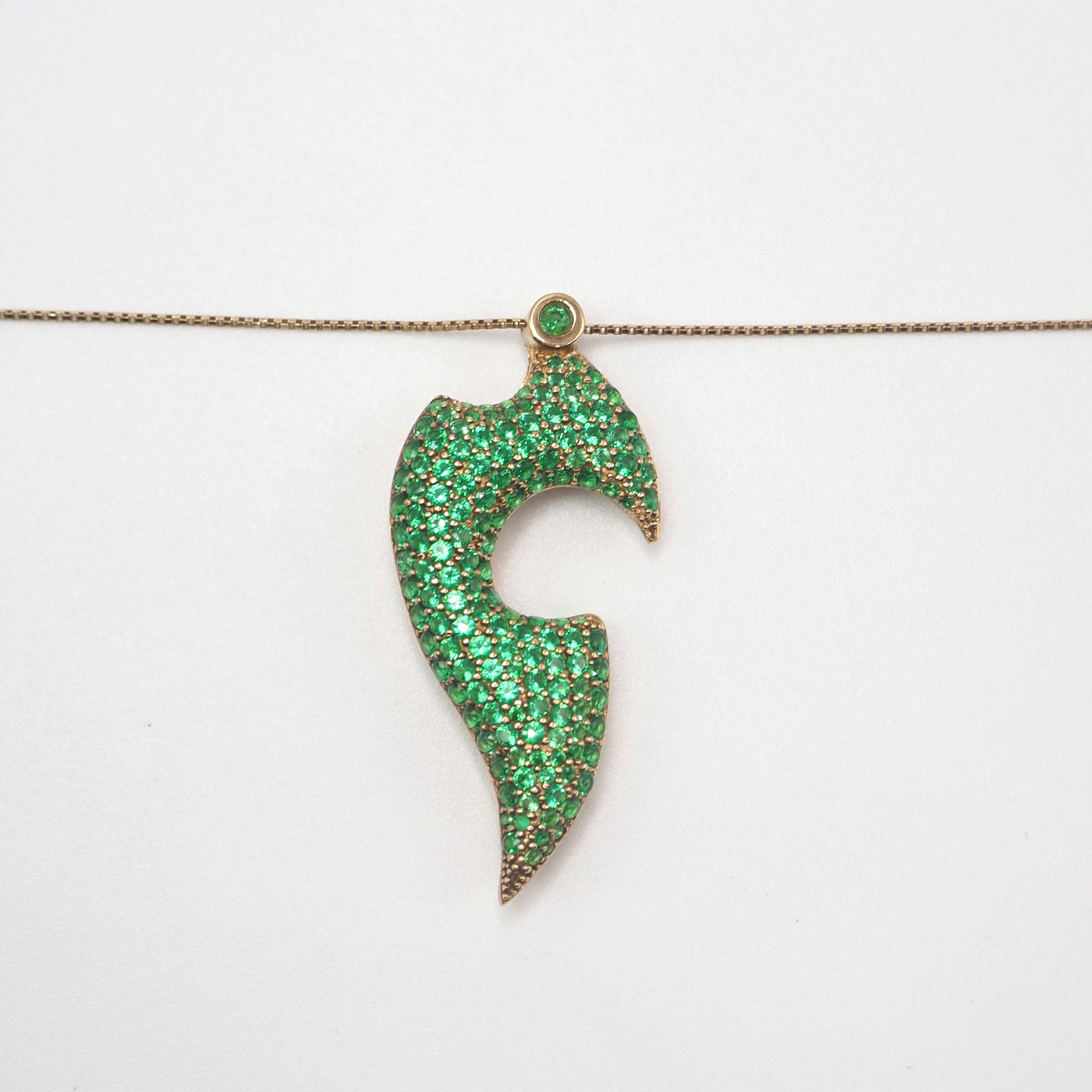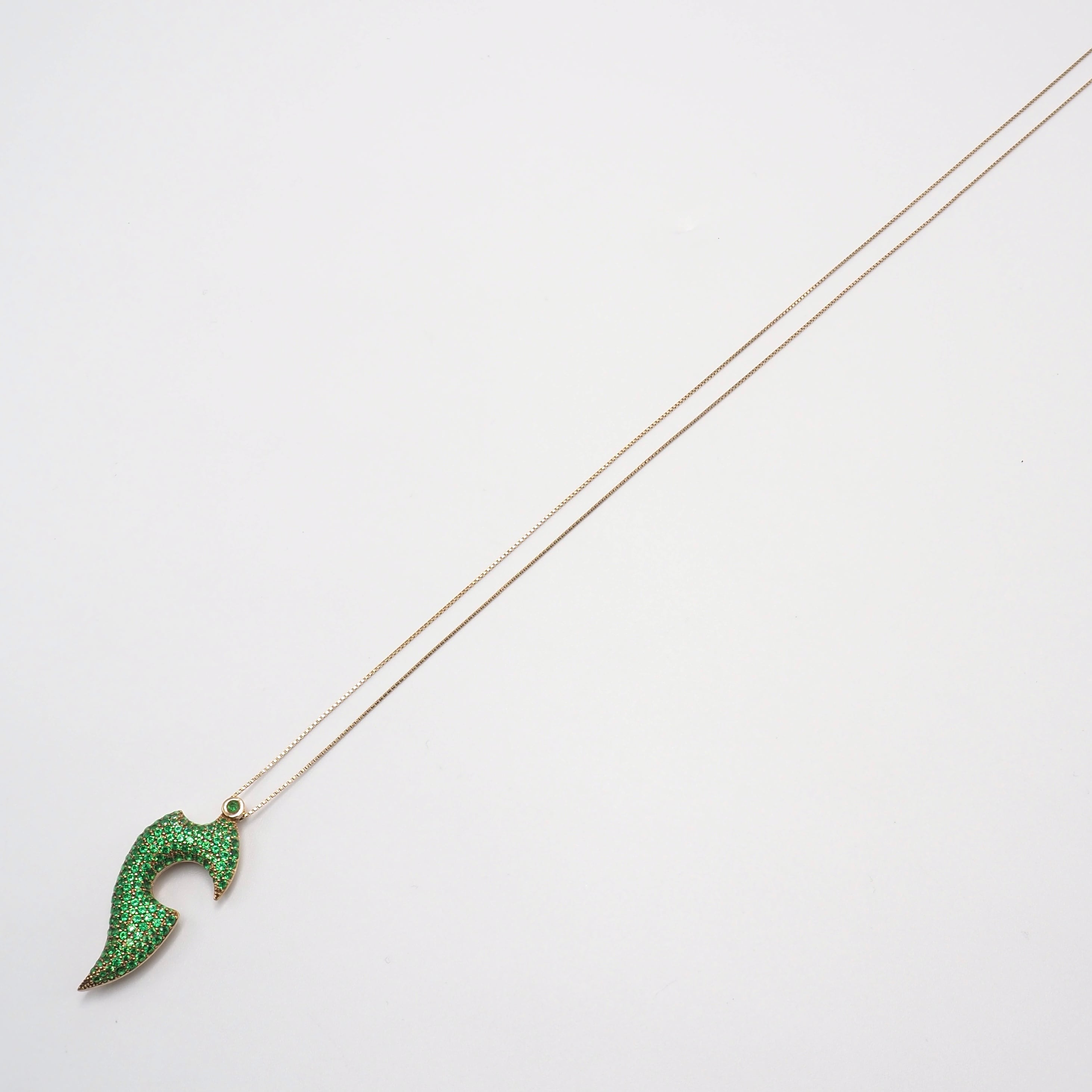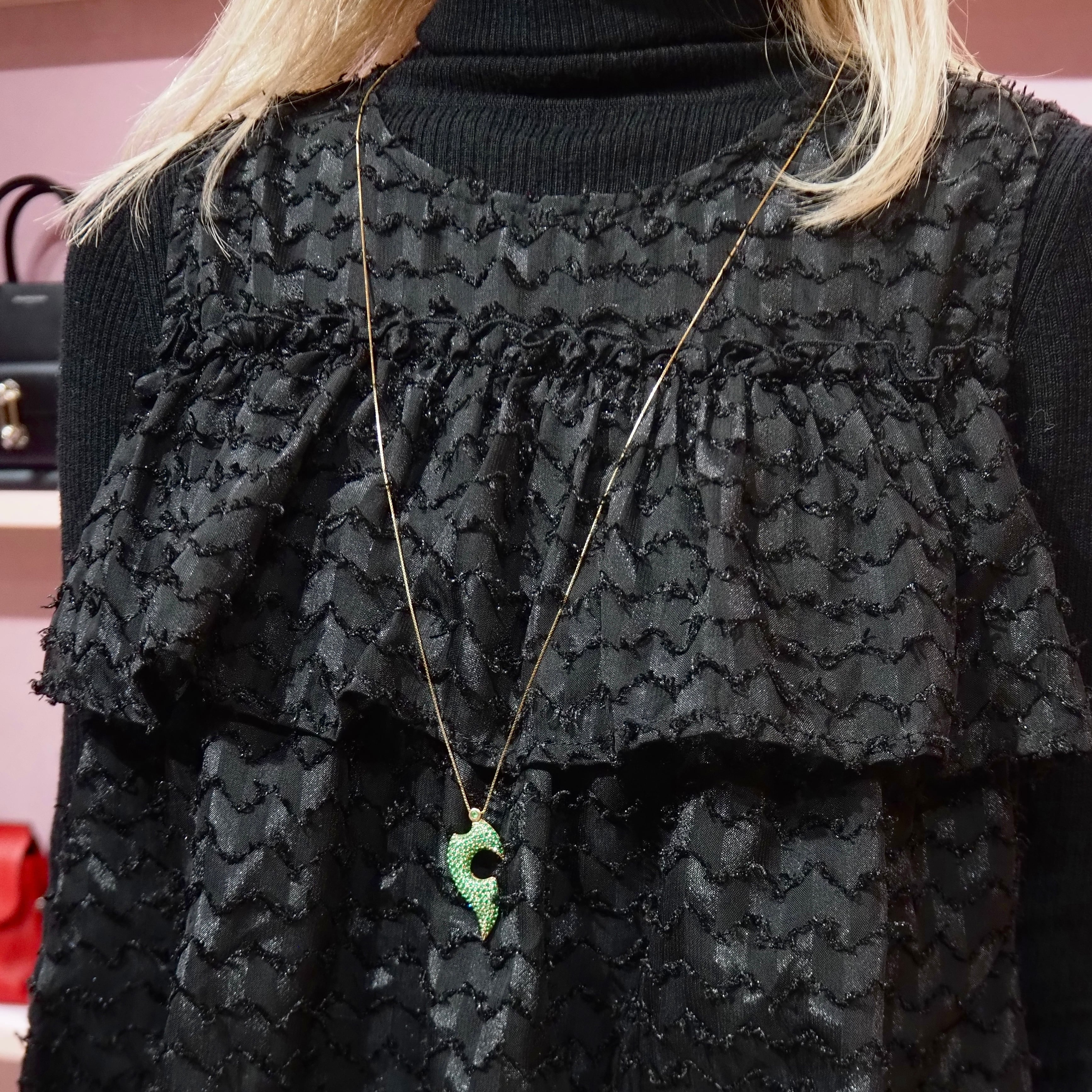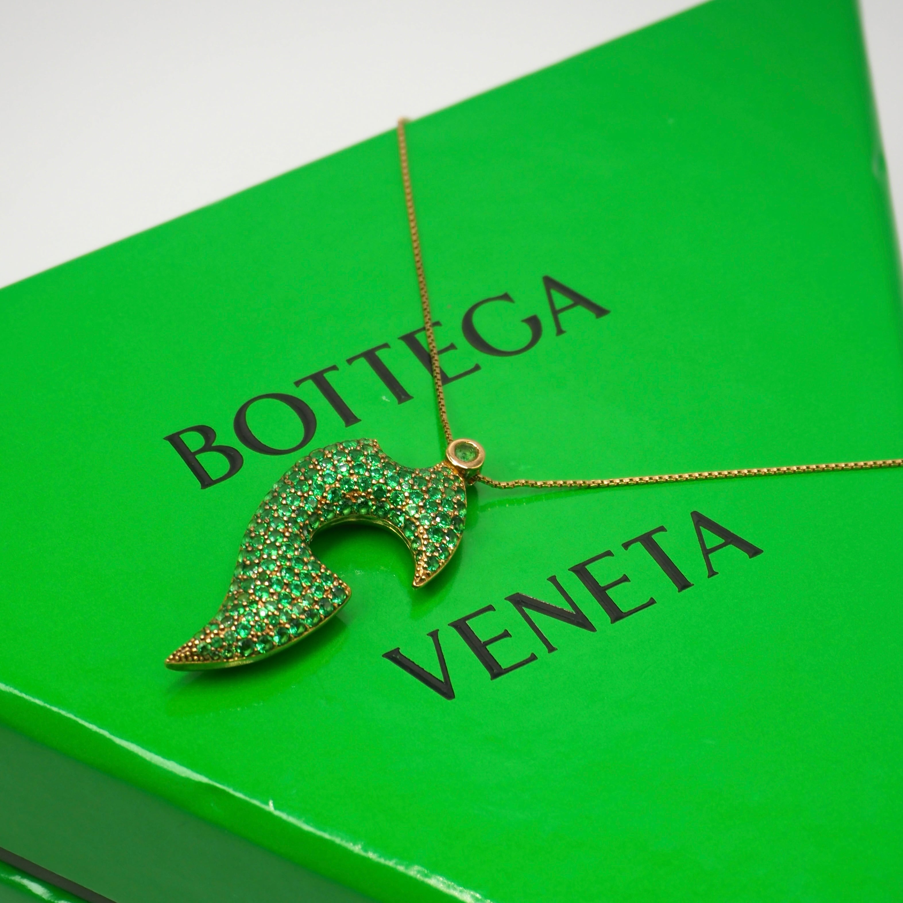 Bottegaのパラキートグリーンが美しいリーフモチーフのネックレス。ボッテガのジュエリーは彫刻的でシャープすぎず、静かに主張するのが特徴。市場でもなかなか出回っていないコレクションのため、珍しさもピカイチ。