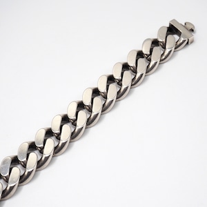 燻の効いたブラックシルバーのカラーが無骨さとヴィンテージ感を演出するアイテム。物足りなさを解消するような、存在感たっぷりなブレスレットです。