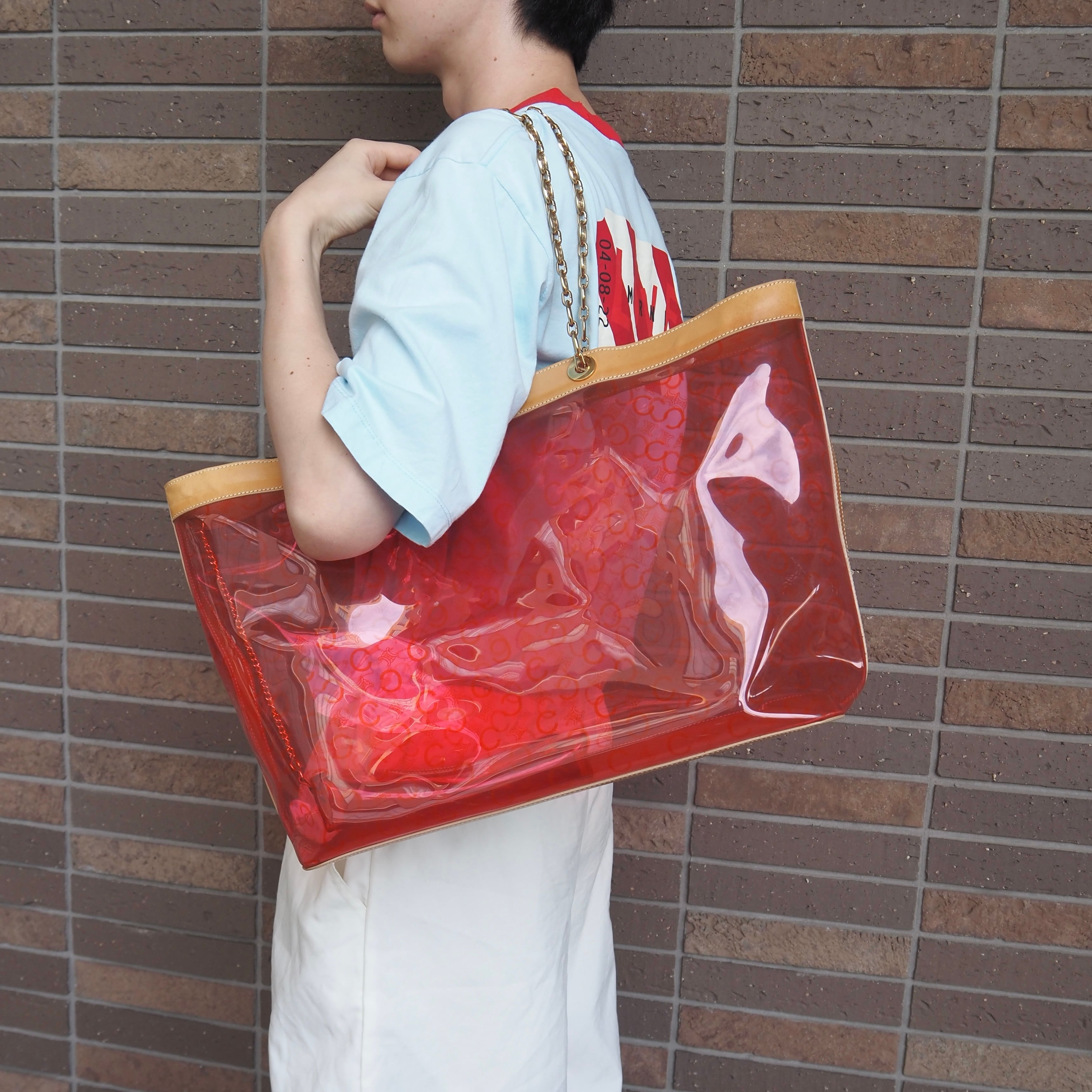 CELINE セリーヌ マカダム柄 クリア トートバッグ レザー ビニール ブラウン レッド
