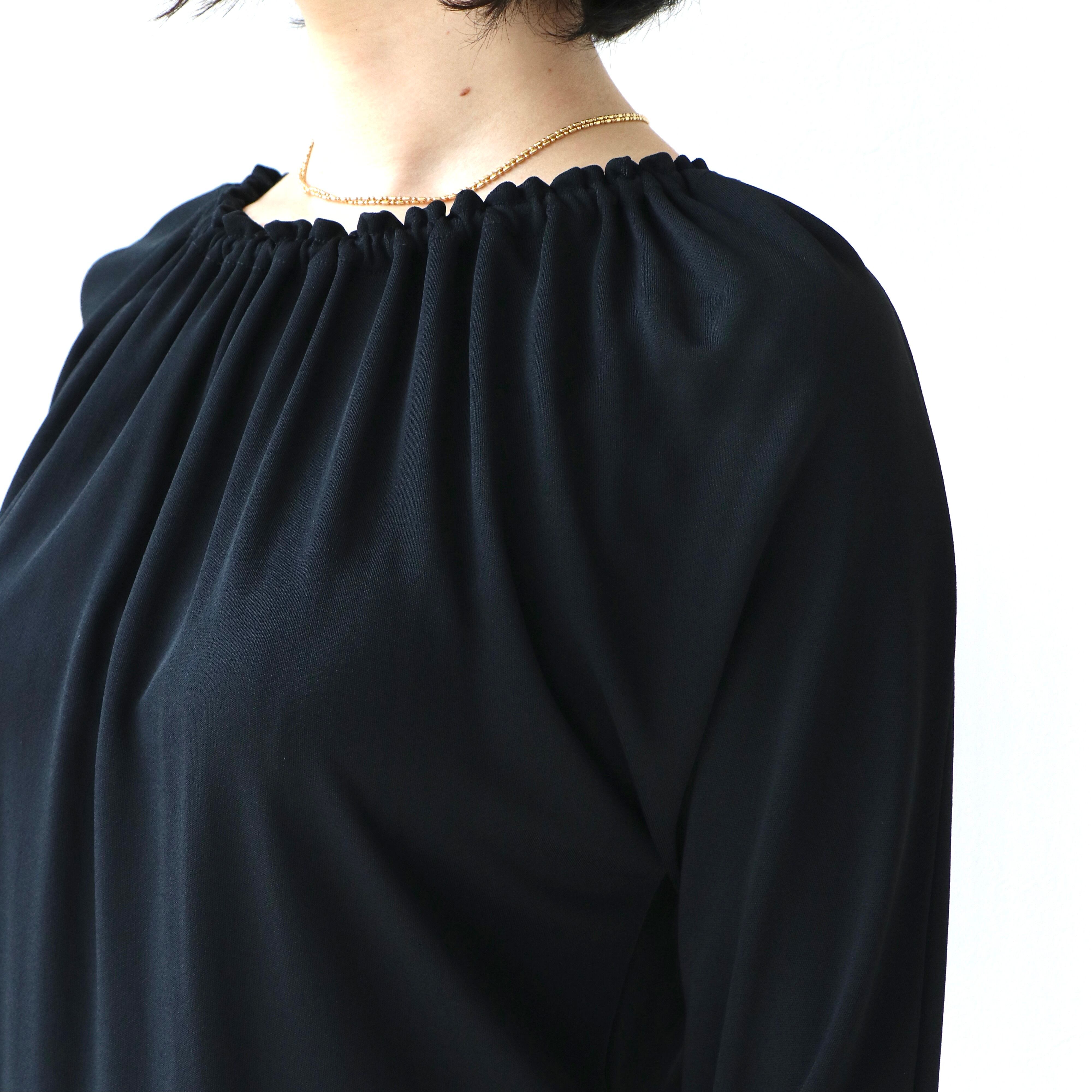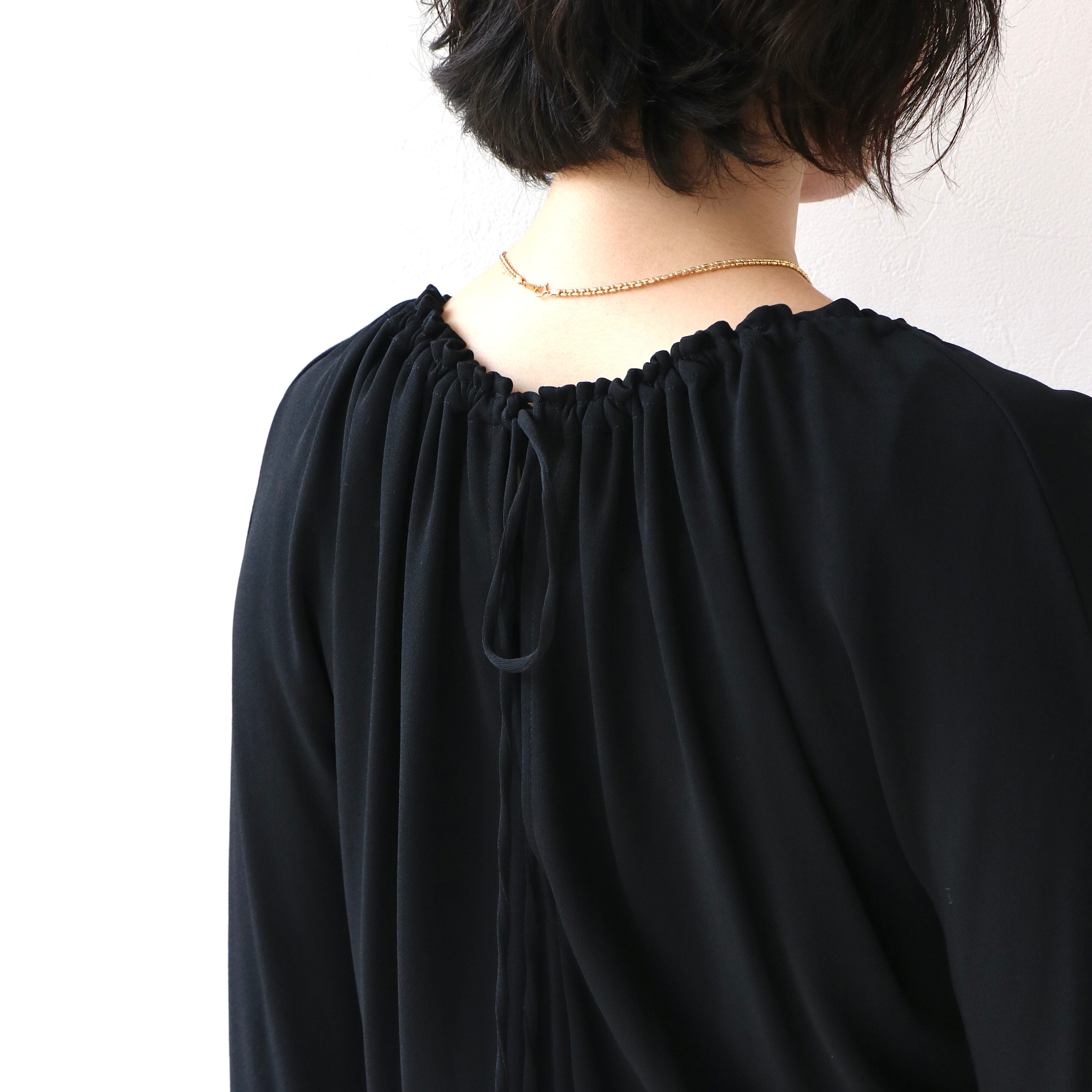 袖部分がラグランスリーブ仕様になっているので肩や腕が動かしやすく、生地にもドレープ感がありレーヨンの光沢感との相性がとても良く、落ち着いた印象を与えてくれます。(d)